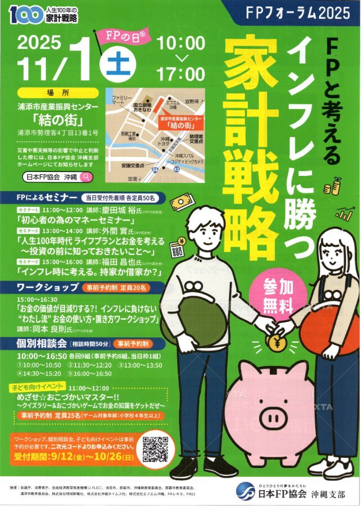 FPフォーラム2025開催お知らせ FPと考える、インフレに勝つ家計戦略 「FPフォーラム2025」 日時:2025年11月1日(土)10:00~17:00 場所:浦添市産業振興センター「結の街」 ▼ファイナンシャルプランナーの福田昌也さんと國場絵梨子さん
