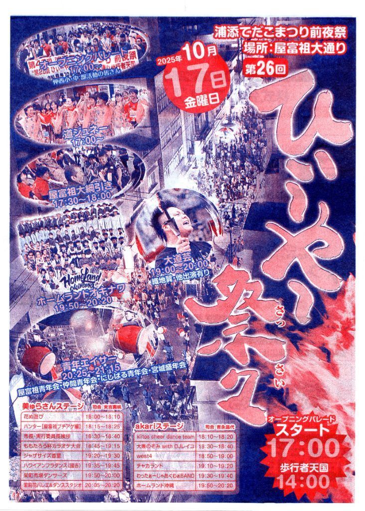 てだこまつり前夜祭いよいよ10月17日(金)開催 てだこまつり前夜祭「ひぃ~や~祭々(さっさい)」が開催されます。 日時:2025年10月17日(金)17:00~ 場所:浦添市屋冨祖通り(14:00から歩行者天国) 皆様のお越しをお待ちしております! ゲスト:屋冨祖通り会 松島会長